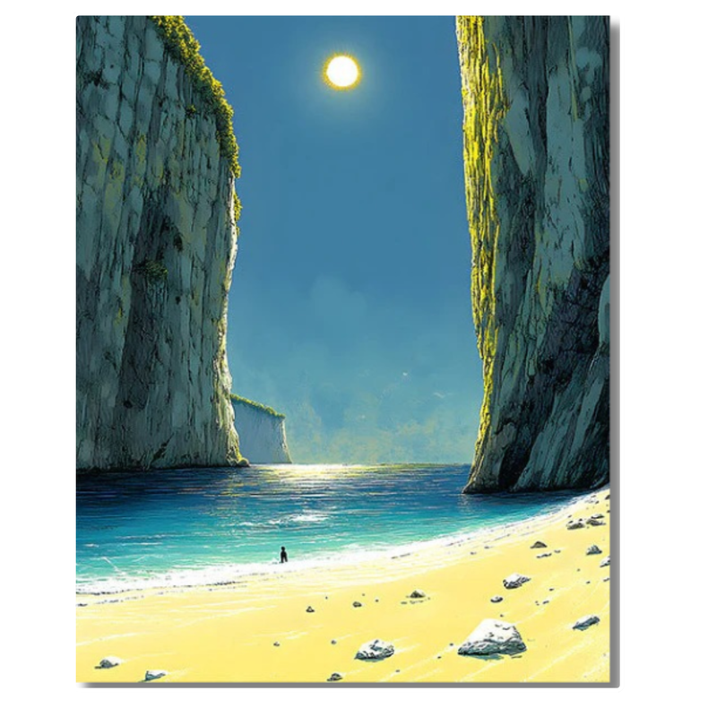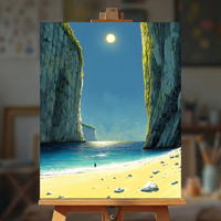 Bring the breathtaking beauty of a hidden coastal cove directly into your home with the "Gateway to Azure." Paint-By-Number kit. This stunning artwork captures the moment golden sunlight meets the deep blue sea, framed by majestic, moss-covered cliffs.